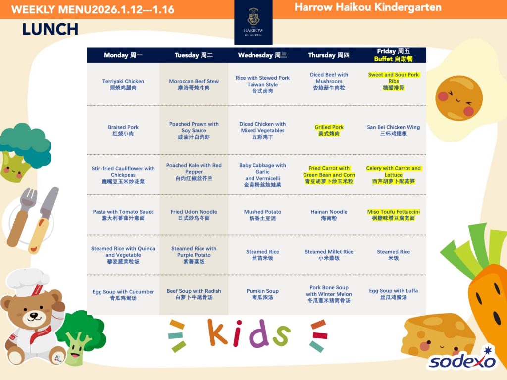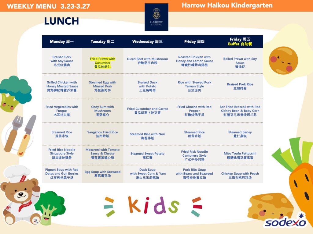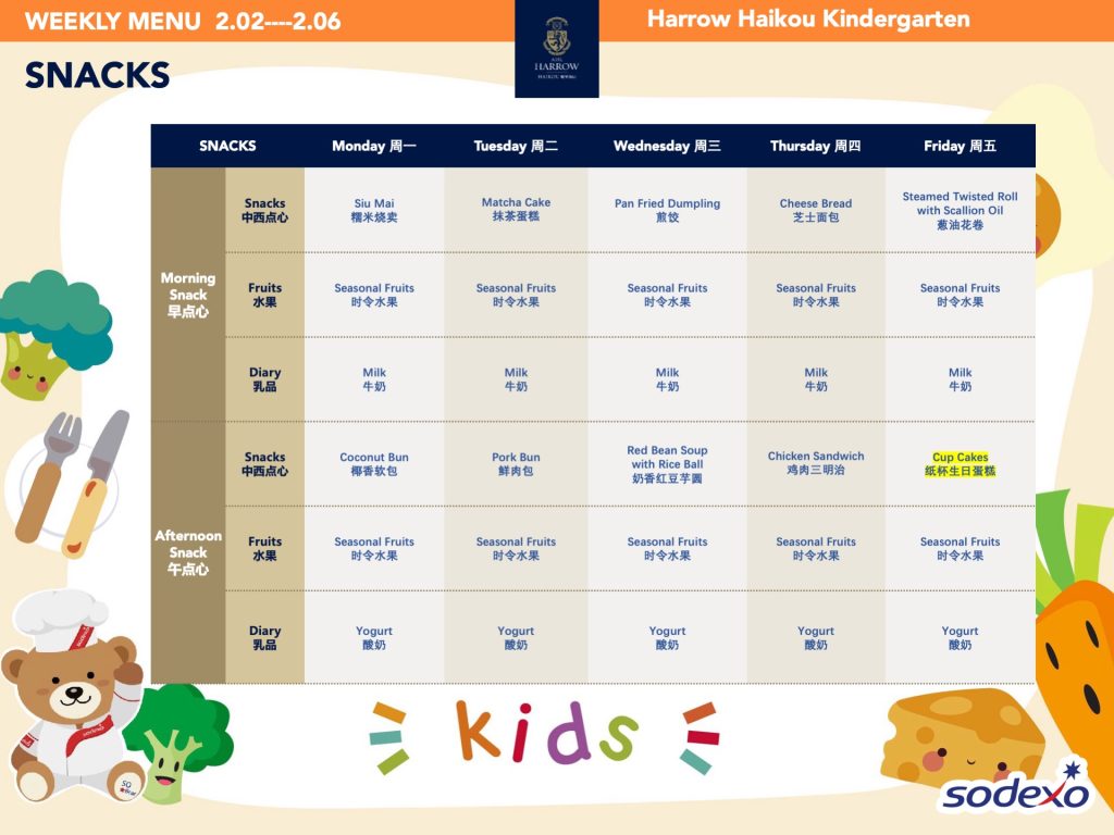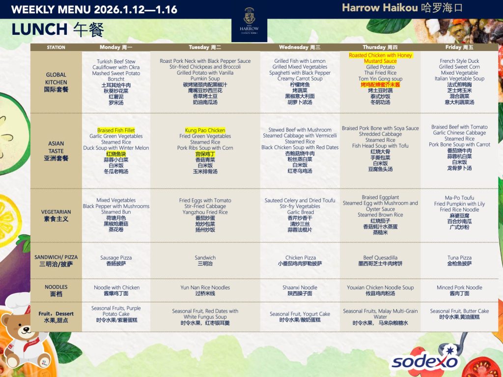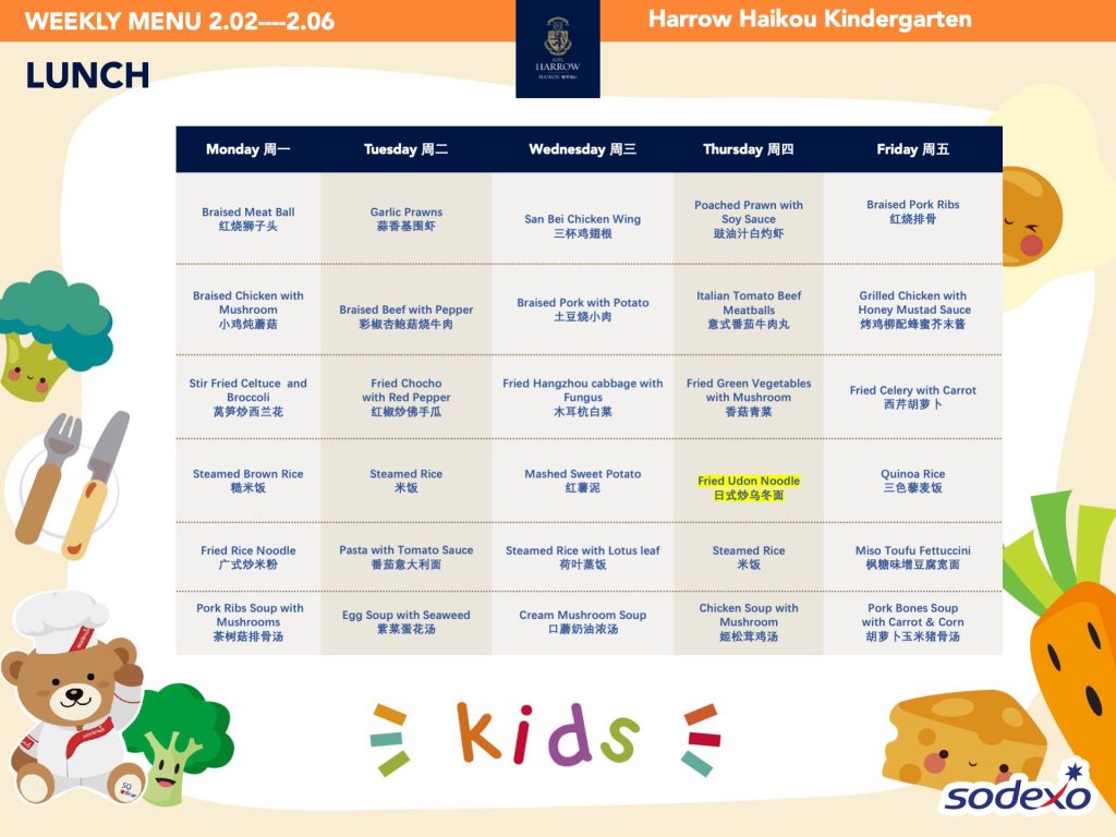 - 学校高级管理团队就午餐及其他食物清单进行定期检查,以确保餐饮质量及其营养平衡。食品药品监督管理局(FDA)和教育局(EDB)为中国的学校提供培训,并规定学校就运营管理餐饮服务所需履行落实的职责和任务。在哈罗海口,我们成立了食品委员会,以保证餐饮质量。委员会每个月有例行的学校菜单制定会议。