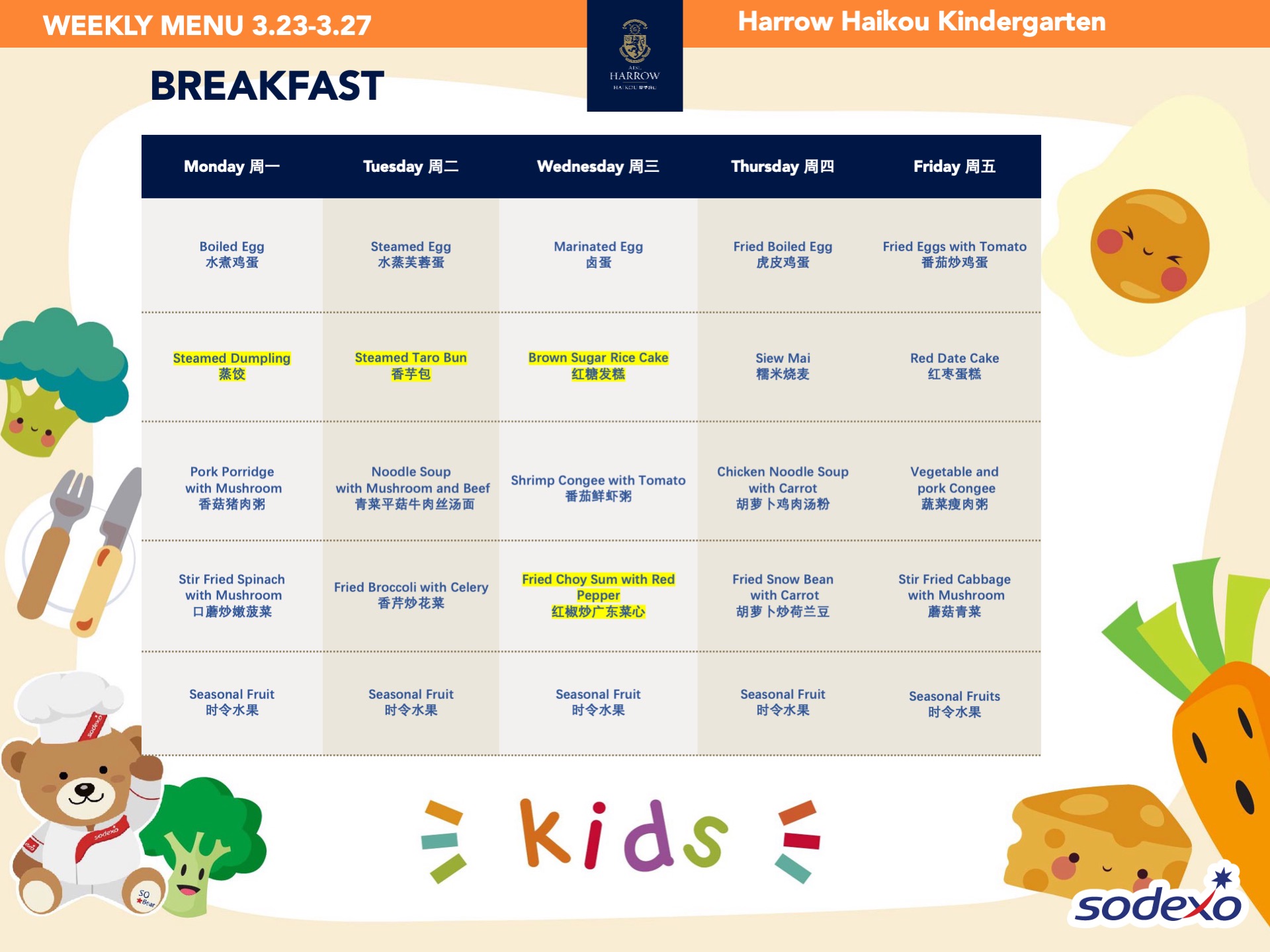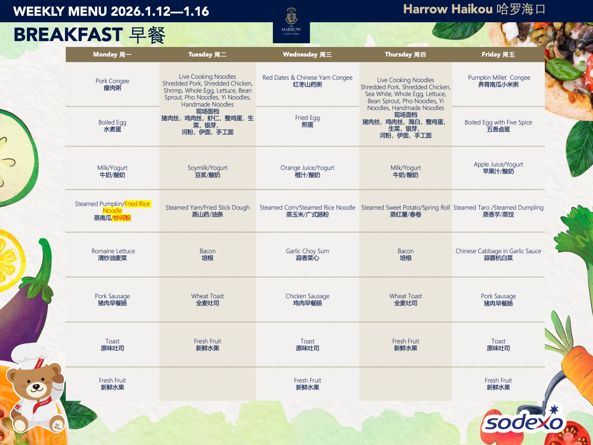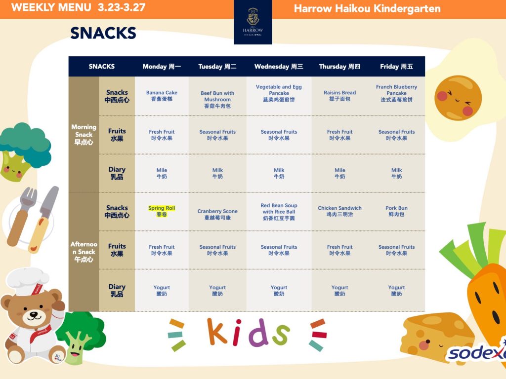 - 学校高级管理团队就午餐及其他食物清单进行定期检查,以确保餐饮质量及其营养平衡。食品药品监督管理局(FDA)和教育局(EDB)为中国的学校提供培训,并规定学校就运营管理餐饮服务所需履行落实的职责和任务。在哈罗海口,我们成立了食品委员会,以保证餐饮质量。委员会每个月有例行的学校菜单制定会议。