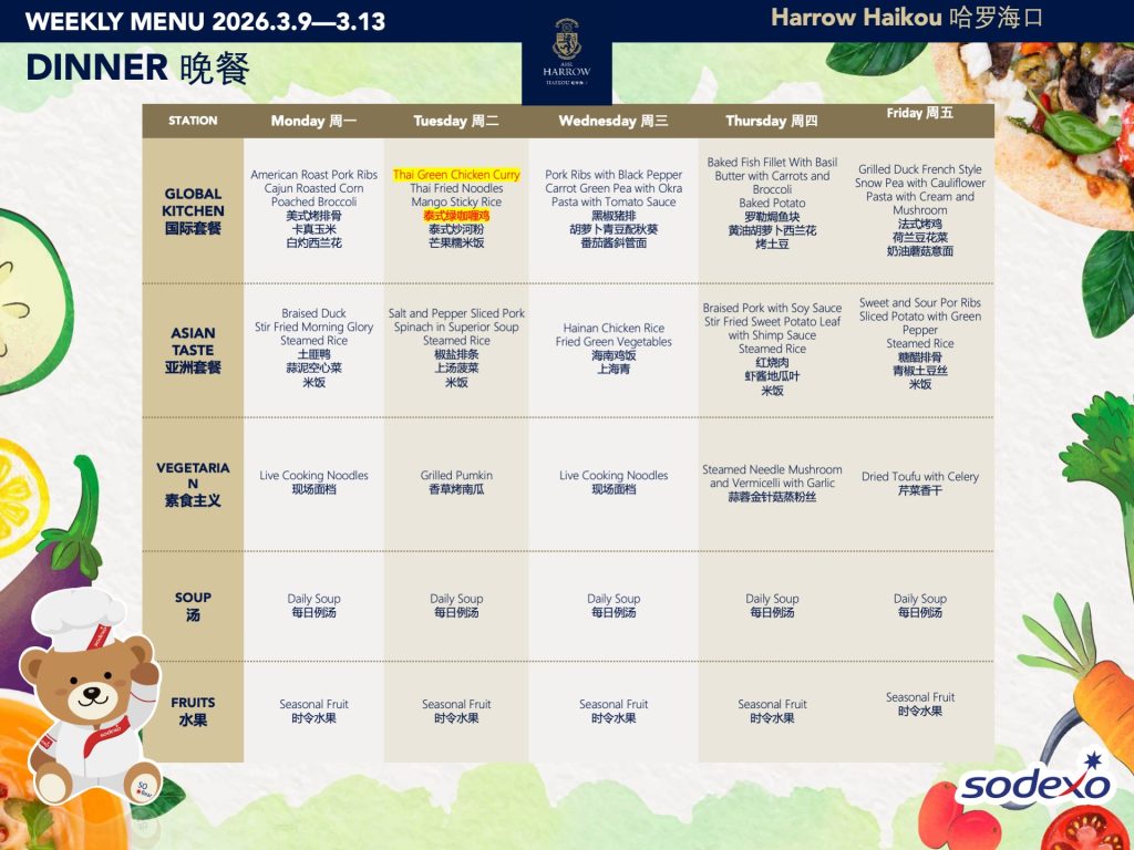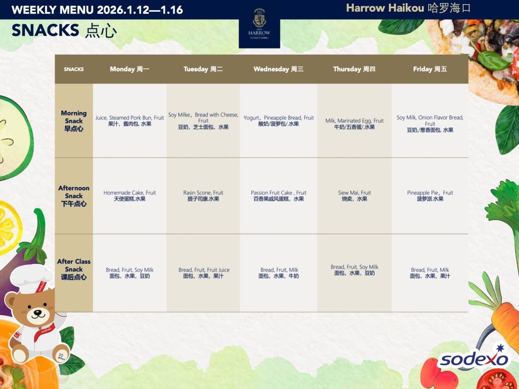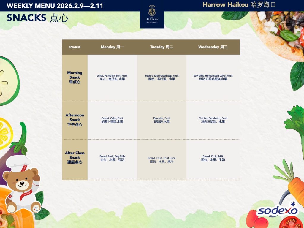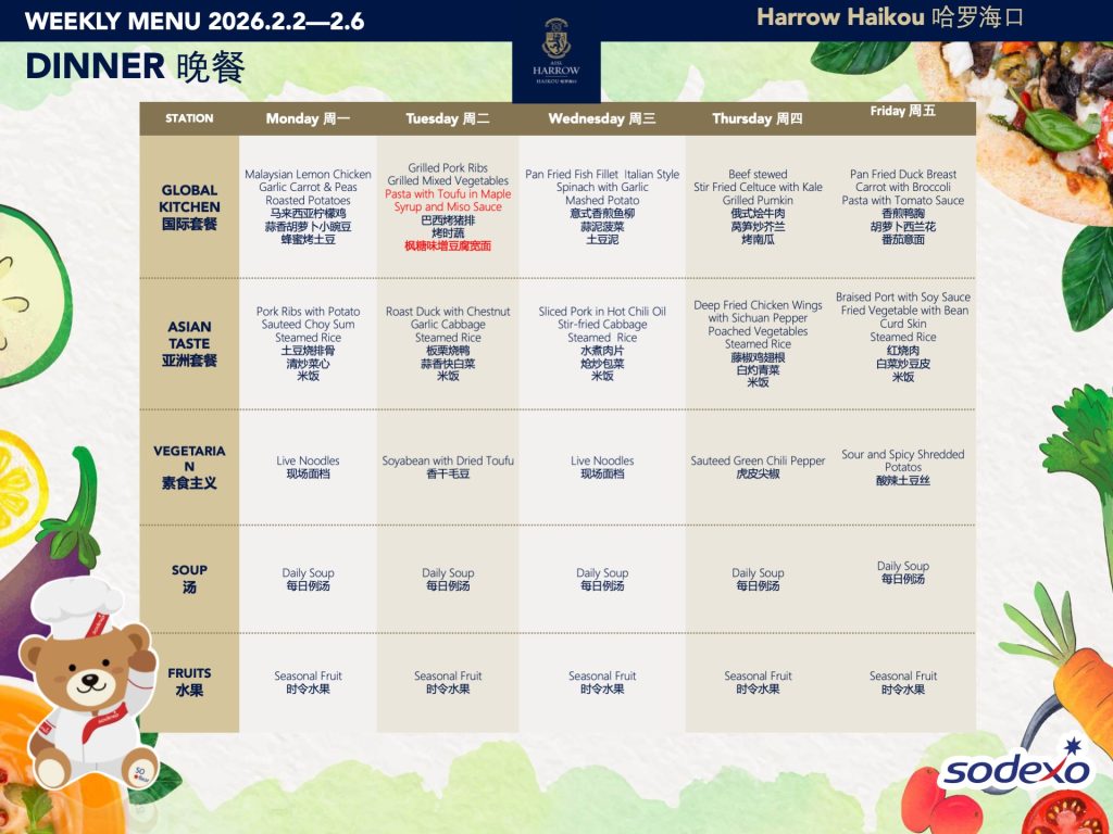 学校为全体学生提供用餐和间点服务。我们力求餐食营养结构均衡,拥有专门针对各年龄段的孩子而设置的菜单机制,配备了专业的营养师,并会在菜单中注明热量、脂肪、蛋白质、碳水化合物的含量以及营养分析和过敏原标识。我们提供西式、亚洲风味、热三明治和披萨、以及素食选择,并有汤、水果和甜点。学校菜单可参考学校官网。对于所有年级的学生,餐厅均提供上午、下午加餐。所有的餐食以及加餐点心均由我们的餐饮公司Sodexo索迪斯按固定价格收费。您可以在孩子的餐卡中充值以支付这些费用。同时,我们还为家长和Y11/G10的孩子新增了咖啡吧,提供饮品和点心,以满足家校互动、家长歇息和相应年级孩子加餐的需要。在哈罗海口,我们希望提供优质的食物和舒适的就餐环境,从而促进学校成员间积极的社交互动。