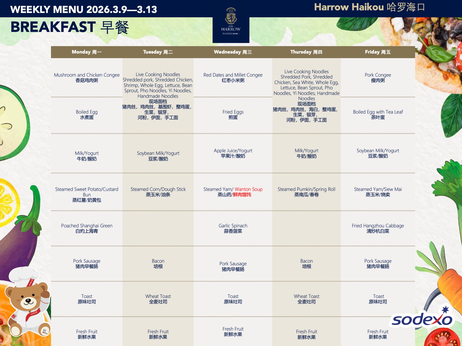 - 我们同时为有特殊饮食需求的学生和员工提供服务,包括素食者和有食物过敏的学生。