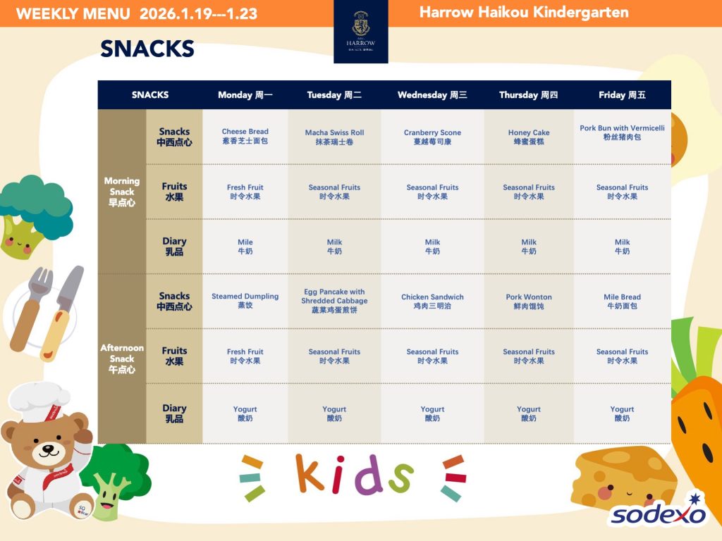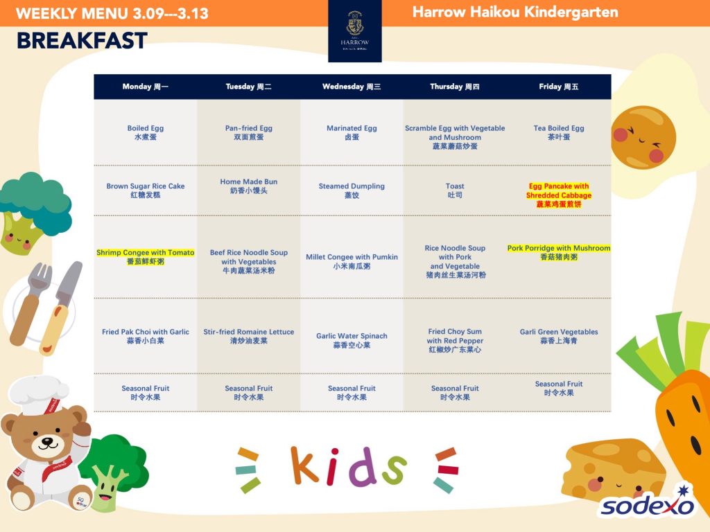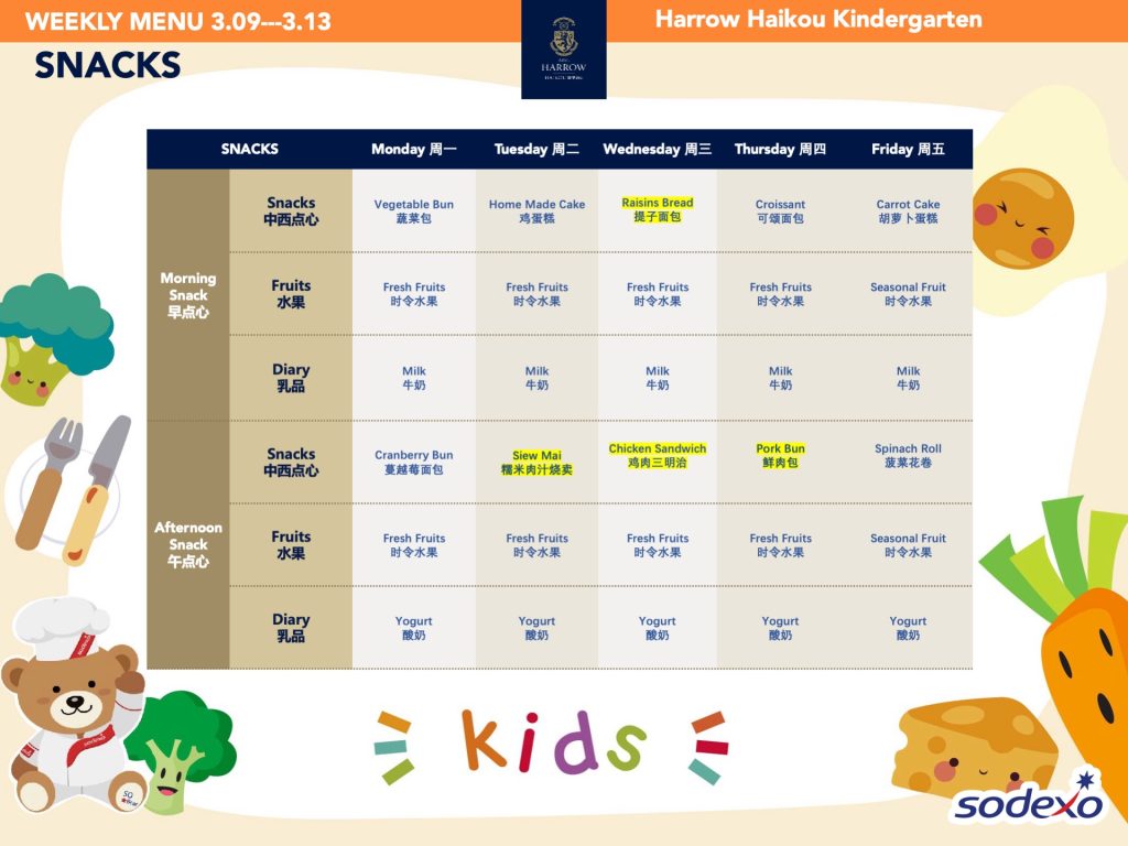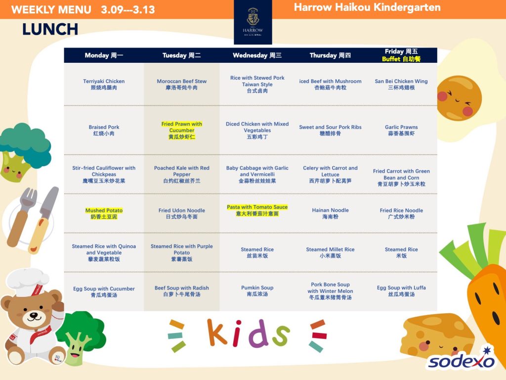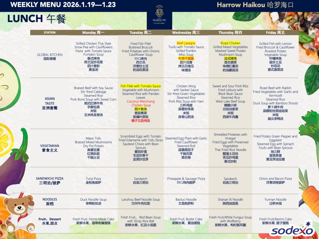 - 学校高级管理团队就午餐及其他食物清单进行定期检查,以确保餐饮质量及其营养平衡。食品药品监督管理局(FDA)和教育局(EDB)为中国的学校提供培训,并规定学校就运营管理餐饮服务所需履行落实的职责和任务。在哈罗海口,我们成立了食品委员会,以保证餐饮质量。委员会每个月有例行的学校菜单制定会议。