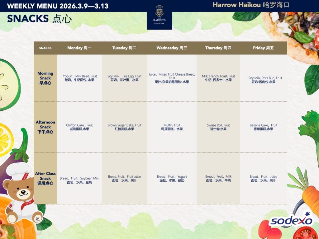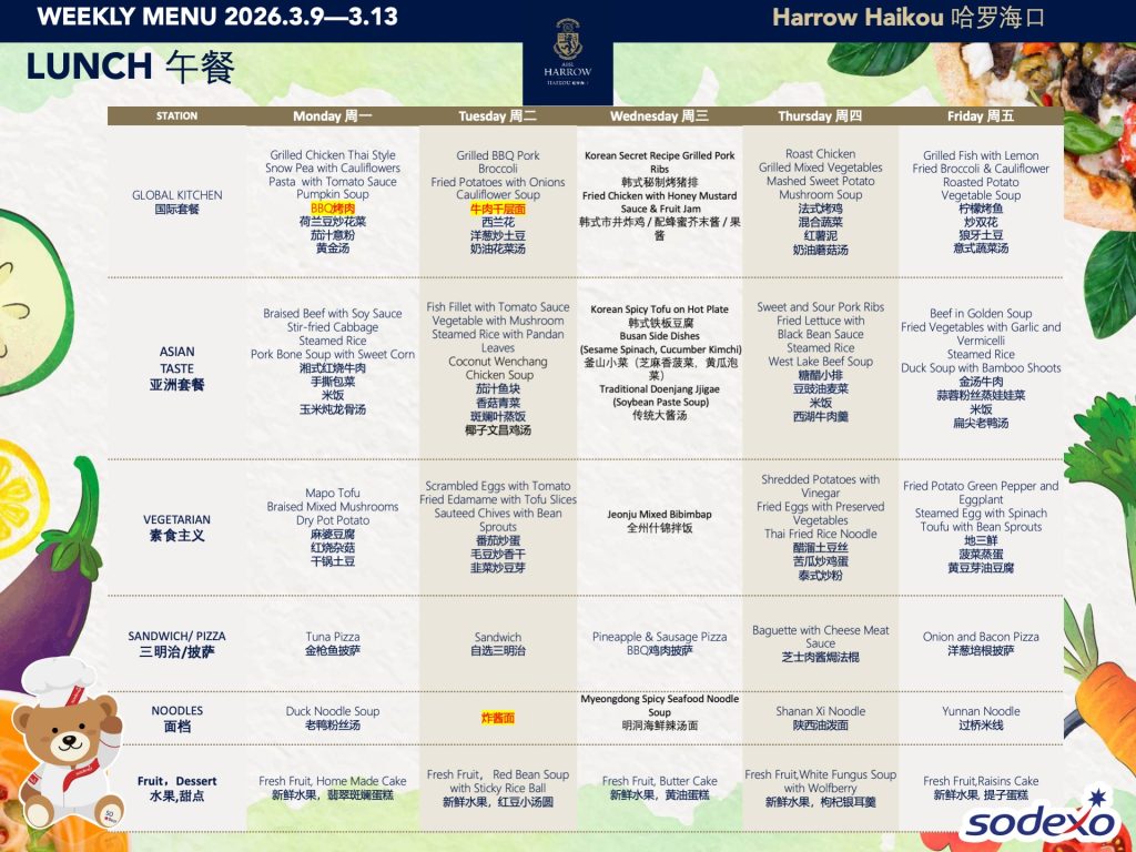 学校为全体学生提供用餐和间点服务。我们力求餐食营养结构均衡,拥有专门针对各年龄段的孩子而设置的菜单机制,配备了专业的营养师,并会在菜单中注明热量、脂肪、蛋白质、碳水化合物的含量以及营养分析和过敏原标识。我们提供西式、亚洲风味、热三明治和披萨、以及素食选择,并有汤、水果和甜点。学校菜单可参考学校官网。对于所有年级的学生,餐厅均提供上午、下午加餐。所有的餐食以及加餐点心均由我们的餐饮公司Sodexo索迪斯按固定价格收费。您可以在孩子的餐卡中充值以支付这些费用。同时,我们还为家长和Y11/G10的孩子新增了咖啡吧,提供饮品和点心,以满足家校互动、家长歇息和相应年级孩子加餐的需要。在哈罗海口,我们希望提供优质的食物和舒适的就餐环境,从而促进学校成员间积极的社交互动。